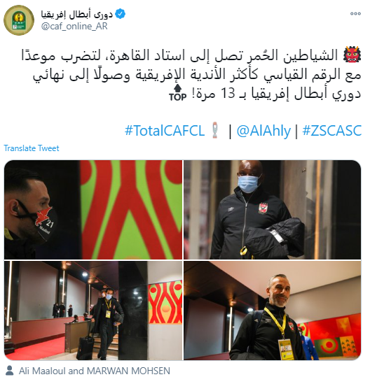 ونشر الاتحاد الإفريقي لكرة القدم "الكاف"، عبر حسابه بموقع تويتر صورا لوصول لاعبو الأهلى إلى ستاد القاهرة، وعلق :" الشياطين الحُمر تصل إلى استاد القاهرة، لتضرب موعدًا مع الرقم القياسي كأكثر الأندية الإفريقية وصولًا إلى نهائي دوري أبطال إفريقيا بـ 13 مرة!".