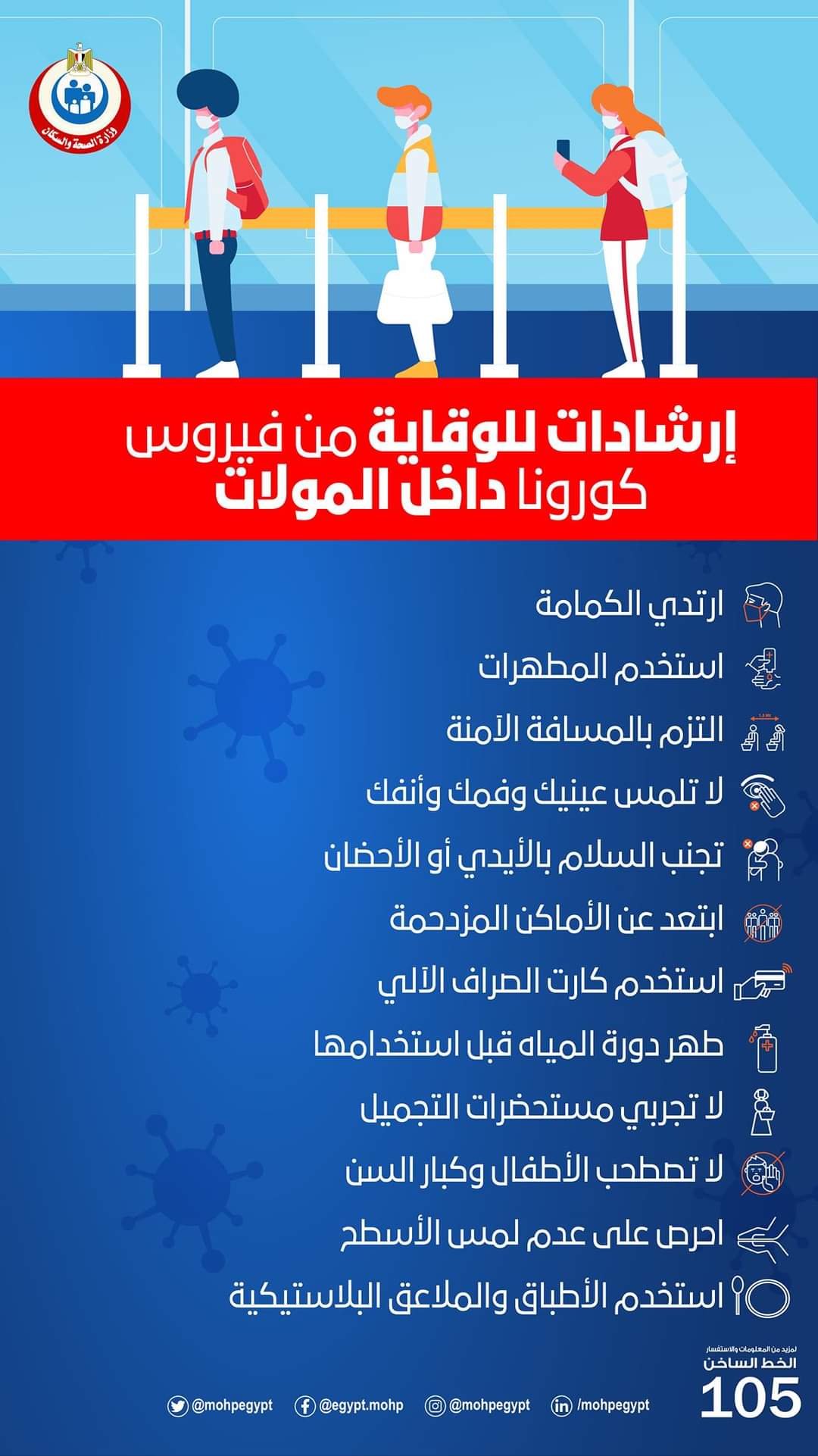 قدمت وزارة الصحة والسكان عبر صفحتها الرسمية على موقع "فيسبوك" إرشادات هامة يجب اتباعها داخل المولات التجارية للوقاية من فيروس كورونا المستجد.