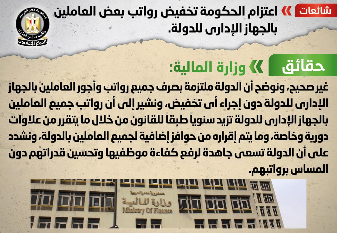 كشف المركز الإعلامى لمجلس الوزراء إنه فى ضوء ما تردد من أنباء بشأن اعتزام الحكومة تخفيض رواتب بعض العاملين بالجهاز الإداري للدولة، تواصل المركز مع وزارة المالية، والتى نفت تلك الأنباء، مُؤكدةً أنه لا صحة لتخفيض رواتب أي من العاملين بالجهاز الإدارى للدولة، مُوضحةً أن الدولة ملتزمة بصرف جميع رواتب وأجور العاملين بالجهاز الإدارى للدولة دون إجراء أى تخفيض، مُشيرةً إلى أن رواتب جميع العاملين بالجهاز الإدارى للدولة تزيد سنوياً طبقاً للقانون من خلال ما يتقرر من علاوات دورية وخاصة، وما يتم إقراره من حوافز إضافية لجميع العاملين بالدولة، مُشددةً على أن الدولة تسعى جاهدة لرفع كفاءة موظفيها وتحسين قدراتهم دون المساس برواتبهم.