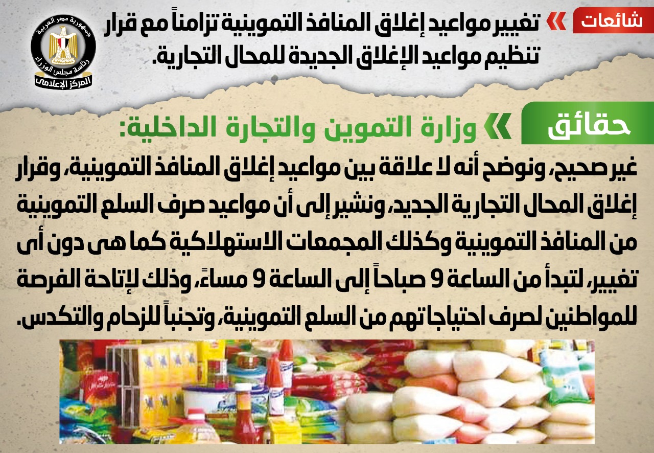 كشف المركز الإعلامى لمجلس الوزراء أنه فى ضوء ما تردد من أنباء بشأن تغيير مواعيد إغلاق المنافذ التموينية تزامناً مع قرار تنظيم مواعيد الإغلاق الجديدة للمحال التجارية، تواصل المركز مع وزارة التموين والتجارة الداخلية، والتي نفت تلك الأنباء، مُؤكدةً أنه لا صحة لتغيير مواعيد إغلاق المنافذ التموينية تزامناً مع قرار تنظيم مواعيد الإغلاق الجديدة للمحال التجارية.