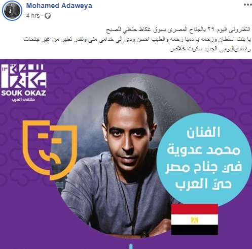 ويعد الحفل الأول لـ عدوية فى السعودية ويحمل عددا من المفاجآت، وعلق قائلا: "انتظرونى اليوم 29 بالجناح المصرى بسوق عكاظ حنغنى للصبح يا بنت السلطان، وزحمة يا دنيا زحمة، والطيب أحسن، وتقدر تطير من غير جنحات، وأغانى ألبومى الجديد سكوت خلاص".
