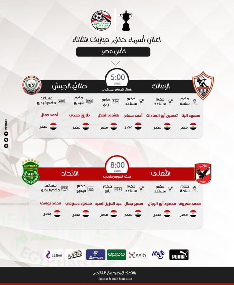 أعلنت لجنة الحكام أسماء الحكام الذين سيتولون إدارة مباراتي الأهلى والاتحاد السكندرى، والزمالك أمام طلائع الجيش فى نصف نهائى بطولة كأس مصر، حيث ستقام مواجهة الزمالك فى الخامسة مساءً على استاد الجيش ببرج العرب، وتقام مباراة الأهلى فى الثامنة مساءً على استاد السويس الجديد.