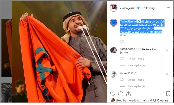 وكتب «الجسمي» على صفحته الرسمية بإنستجرام: "نلقاكم بكل حب وشوق بإذن الله يوم ٢٩ يونيو في منصّة النهضة في الرباط، في حفل ختام مهرجان موازين 2019".