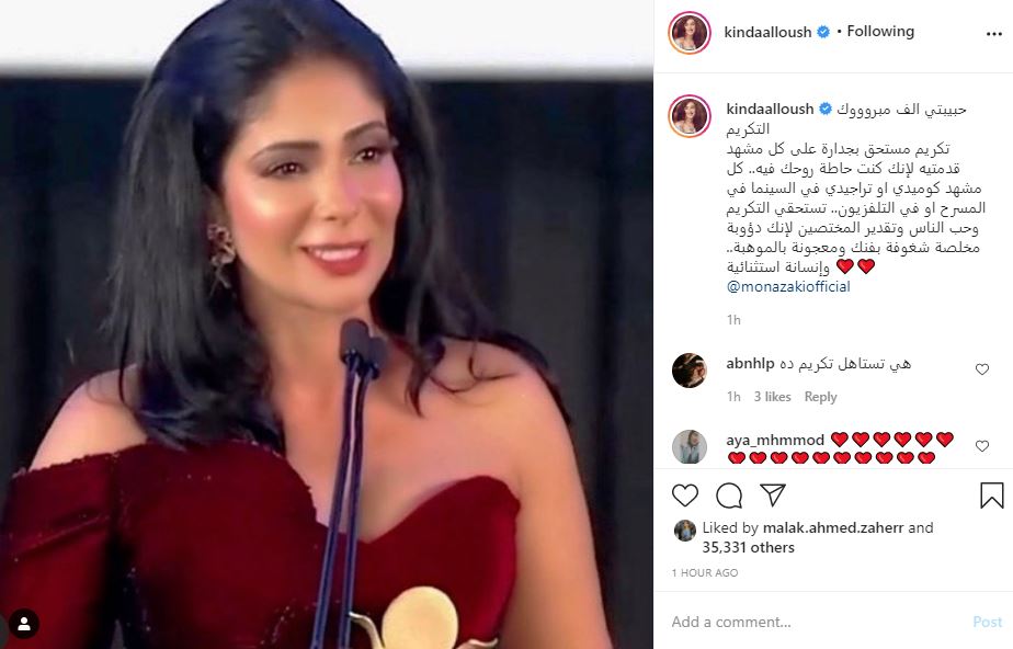 ونشرت كندة، صورة لمنى زكى أثناء التكريم عبر حسابها على إنستجرام، وكتبت عليها قائلة:"حبيبتى ألف مبروك التكريم، تكريم مستحق بجدارة على كل مشهد قدمتيه لانك كنت حاطة روحك فيه كل مشهد كوميدى أو تراجيدى فى السينما فى المسرح أو فى التلفزيون تستحقى التكريم وحب الناس وتقدير المختصين لأنك دؤوبة مخلصة شغوفة بفنك ومعجونة بالموهبة وإنسانة استثنائية".