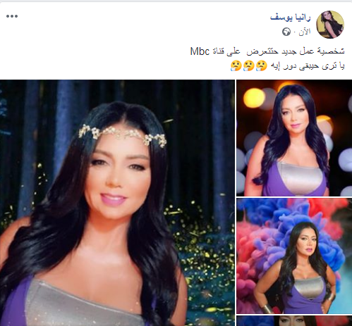 نشرت الفنانة رانيا يوسف مجموعة من الصور على صفحتها بموقع التواصل الاجتماعي "فيس بوك"، وعلقت قائلة:"شخصية عمل جديد حتتعرض على قناة Mbc، يا ترى حيبقى دور إيه؟ ".
