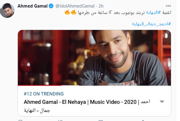 احتفى المطرب أحمد جمال بتواجد كليب أغنيته الأخيرة "النهاية" ضمن التريندات الأكثر بحثاً على موقع يوتيوب، وذلك بعد 12 ساعة فقط من طرحها، حيث نشر تغريدة من خلال حسابه على تويتر، وقال: "أغنية النهاية تريند يوتيوب بعد ١٢ ساعة من طرحها".