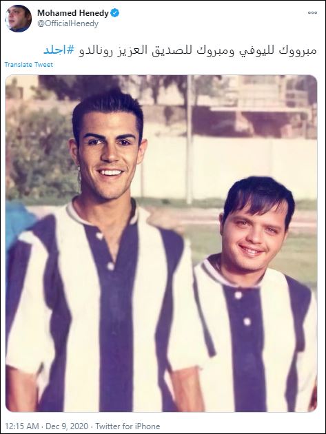 ونشر النجم محمد هنيدى صورته بجوار كريستيانو رونالدو، وعلق قائلا: "مبرووك لليوفي ومبروك للصديق العزيز رونالدو اجلد".