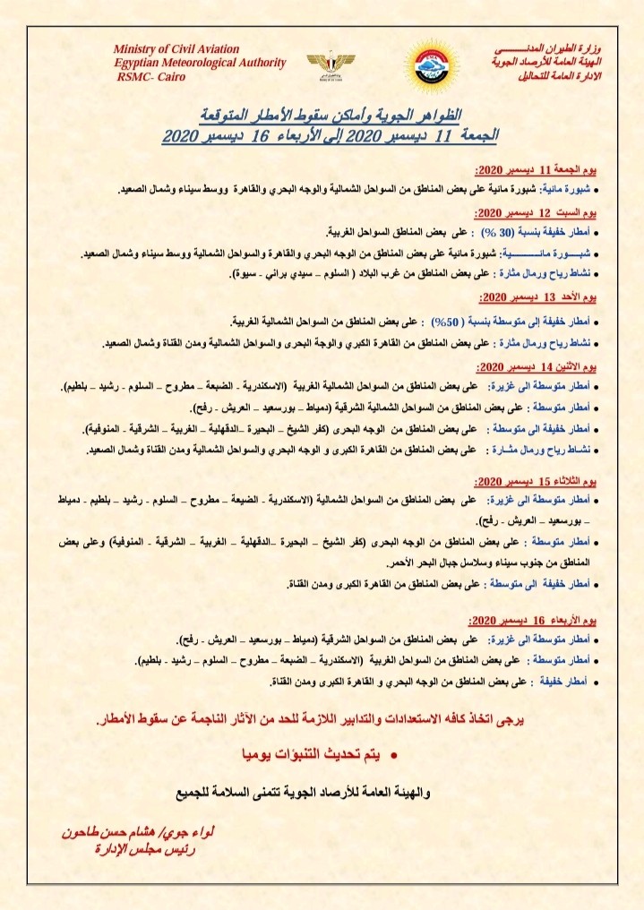أمطار خفيفة الى متوسطة: على بعض المناطق من الوجه البحرى ( كفر الشيخ - البحيرة الدقهلية - الغربية - الشرقية - المنوفية ).