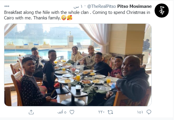 وصلت عائلة بيتسو موسيمانى، المدير الفنى للنادى الأهلى، إلى القاهرة للاحتفال مع مدرب القلعة الحمراء بأعياد الميلاد، ونشر موسيمانى صورة عبر حسابه الشخصى على تويتر جمعته بعائلته وعلق عليها قائلا، "الإفطار على نهر النيل مع العائلة التى جاءت لقضاء عيد الميلاد فى القاهرة معى، شكرا للعائلة."