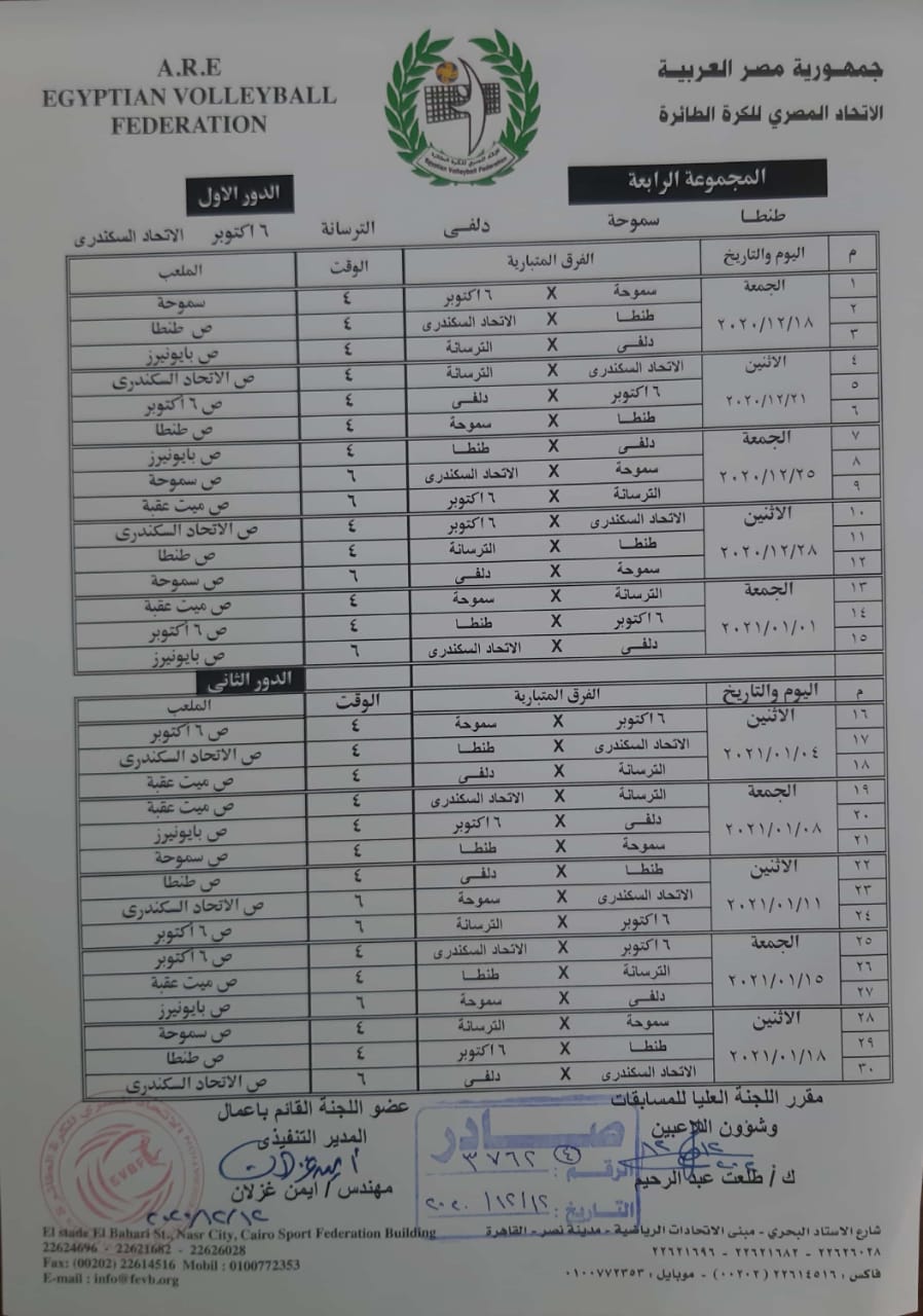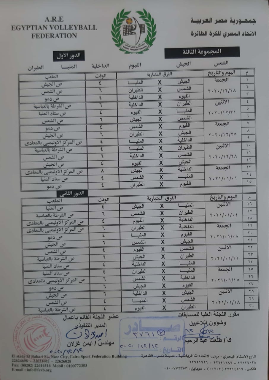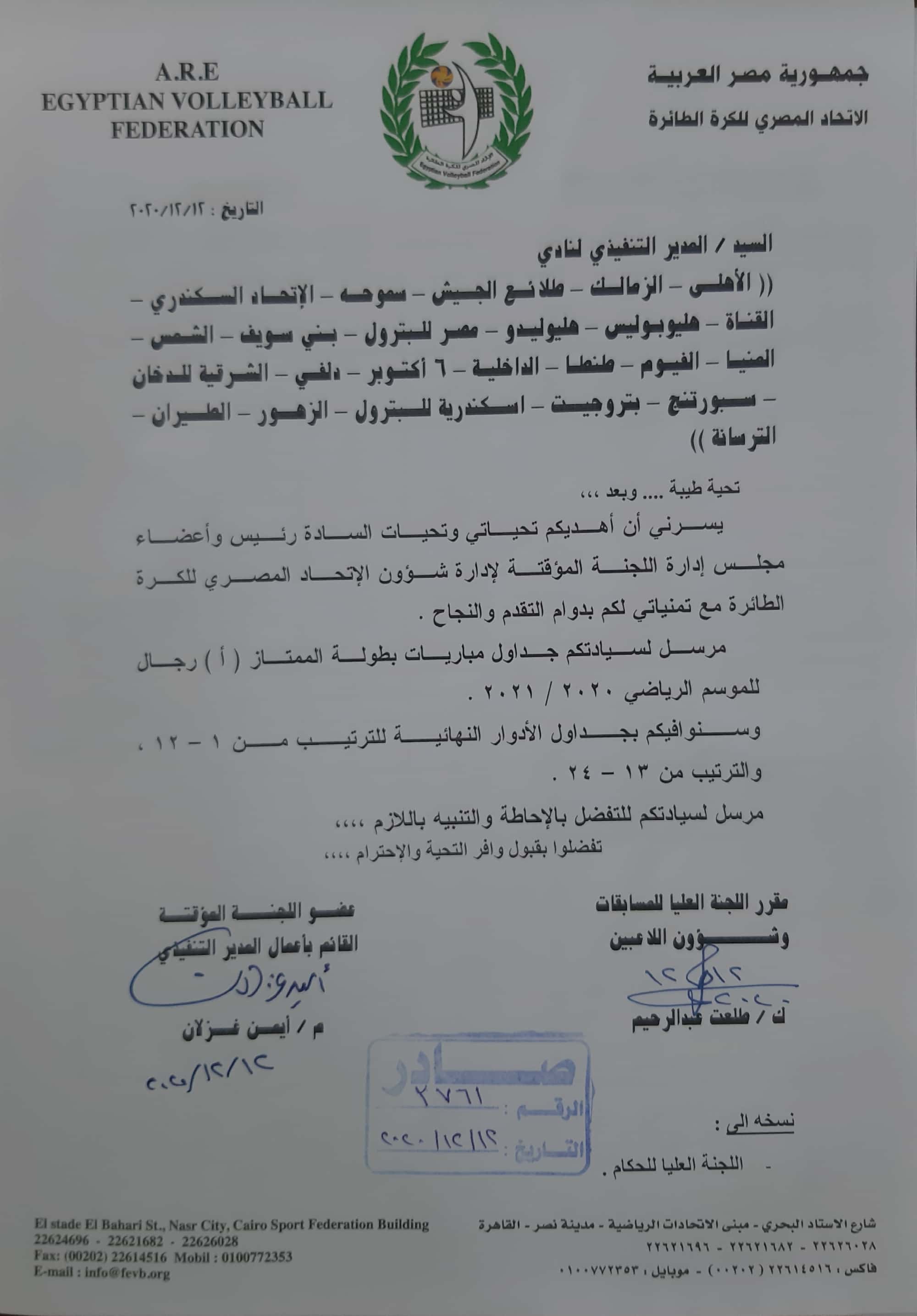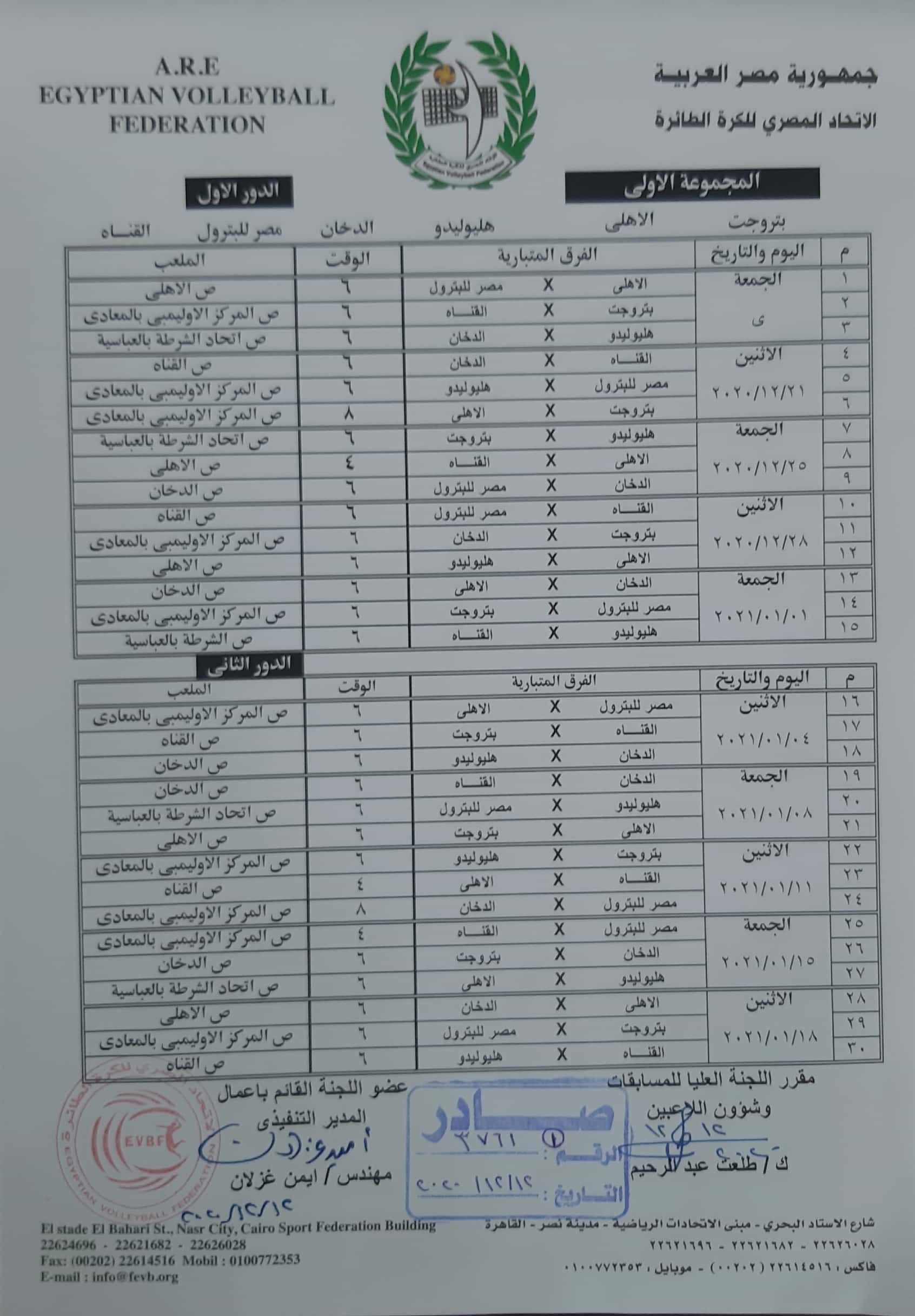 أعلنت لجنة المسابقات باتحاد الكرة الطائرة جدول مباريات الدورى الممتاز للموسم المحلى الجديد 2020 / 2021 والمقرر انطلاقه يوم 18 ديسمبر الجارى مقسماً على 4 مجموعات، وتشهد الجولة الأولى مواجهات قوية بالمجموعة الأولى بين كل من الأهلى مع مصر للبترول وبتروجت مع القناة، وهليوليدو مع الشرقية للدخان.
