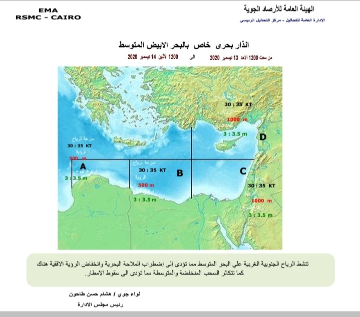 أصدرت الهيئة العامة للأرصاد الجوية إنذارا بحريا خاصا بالبحر الأبيض المتوسط من غد الأحد 13 ديسمبر 2020 إلى الإثنين 14 ديسمبر، وكشفت الهيئة العامة للأرصاد الجوية، أن البحر المتوسط يشهد نشاطا للرياح الجنوبية الغربية على البحر المتوسط، ما يؤدي إلى اضطراب الملاحة البحرية وانخفاض الرؤية الأفقية، كما تتكاثر السحب المنخفضة والمتوسطة، ما يودي إلى سقوط الأمطار.