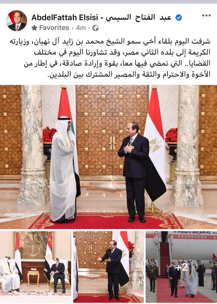 وكتب الرئيس: "شرفت اليوم بلقاء أخى سمو الشيخ محمد بن زايد آل نهيان، وزيارته الكريمة إلى بلده الثانى مصر، وقد تشاورنا اليوم فى مختلف القضايا.. التى نمضى فيها معا، بقوة وإرادة صادقة، فى إطار من الأخوة والاحترام والثقة والمصير المشترك بين البلدين".
