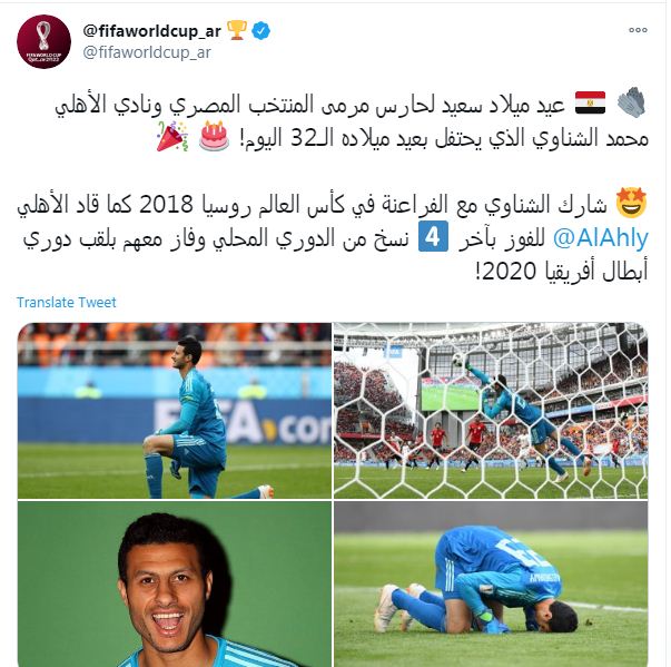 هنأ حساب كأس العالم النجم المصري محمد الشناوى بمناسبة عيد ميلاده الـ 32 ، وذكر الحساب الرسمى لكأس العالم على "تويتر" إنجازات الشناوى مع منتخب الفراعنة فى كأس العالم بروسيا 2018 وسجله بطولاته مع الأهلى، قائلا: "عيد ميلاد سعيد لحارس مرمى المنتخب المصري ونادى الأهلي محمد الشناوى الذى يحتفل بعيد ميلاده الـ 32 اليوم".