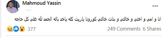 أعلن محمود ياسين جونيور حفيد النجم الراحل محمود ياسين عن إصابته بفيروس كورونا، بعد إعلان والدته إصابتها بالفيروس، مع عدد من أفراد أسرتها، حيث كتب عبر حسابه بموقع "فيس بوك": "أنا وأمي وأختي وخالتي وبنات خالتي كورونا، ياريت كله ياخد باله الحمد لله علي كل حاجة"، كما كتب والدة السيناريست عمرو محمود ياسين عبر حسابه :" الحمدلله على كل شيء بس بالنسبة لـ 2020 في حاجه تاني ولا خلاص؟".