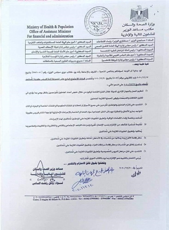 أصدرت وزارة الصحة والسكان عدة توجيهات مهمة لقطاعتها المختلفة تشمل تخفيف اعداد العاملين بالجهاز الإداري للدولة خلال الفترة القادمة ليكون من خلال خفض أعداد العاملين المتواجدين بشكل يومي بما يؤدي إلى تقليل الكثافات، كما شددت على التزام العاملين والمترددين على كل الأسواق وكافة المواطنين باتخاذ الإجراءات الاحترازية.