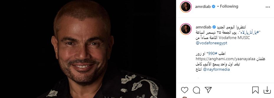 أعلن الهضبة عمرو دياب عبر حسابه الرسمي بموقع "انستجرام"، عن طرح ألبومه المقبل "يا أنا يا لا" غدا الجمعة 25 ديسمبر الساعة الثامنة مساءً، عبر إحدى المنصات ، وذلك تزامنا مع احتفالات أعياد الكريسماس، والذى يضم 14 أغنية، ويعد هذا الألبوم حالة خاصة لأنه يضم عددًا من الأغانى المميزة والمتنوعة فى كل لون غنائى.