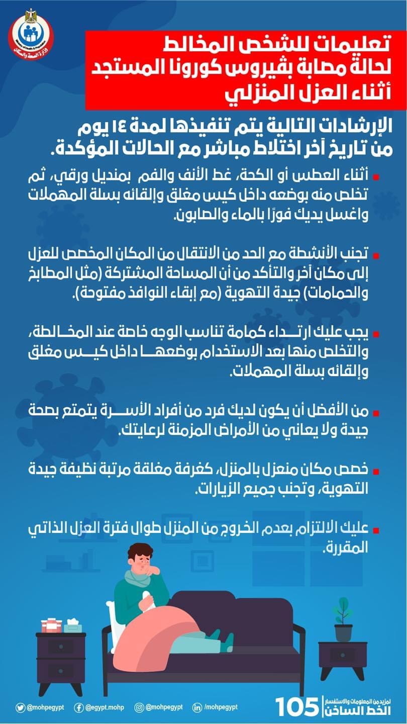 كشفت وزارة الصحة والسكان فى منشور لها عن تعليمات للأشخاص المخالطين لحالة مصابة بـفيروس كورونا أثناء العزل المنزلى.