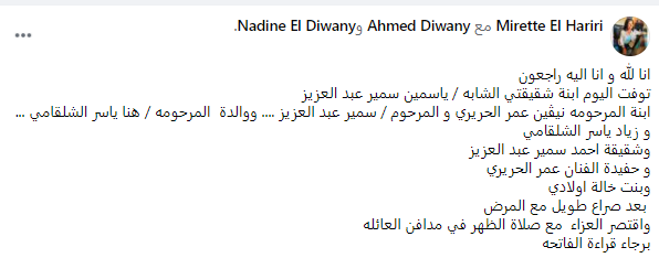 وكتبت ميريت الحريري عبر حسابها الشخصي على موقع التواصل الاجتماعي "فيس بوك" مساء اليوم: "إنا لله وإنا إليه راجعون توفيت اليوم ابنة شقيقتي الشابة ياسمين سمير عبد العزيز ابنة المرحومة نيڤين عمر الحريري والمرحوم سمير عبد العزيز ووالدة المرحومة هنا ياسر الشلقامي وزياد ياسر الشلقامي وشقيقة أحمد سمير عبد العزيز وحفيدة الفنان عمر الحريري وبنت خالة أولادي بعد صراع طويل مع المرض واقتصر العزاء مع صلاة الظهر في مدافن العائلة برجاء قراءة الفاتحة".