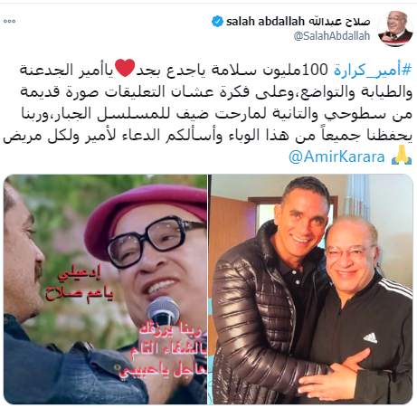 وجه الفنان صلاح عبدالله، رسالة دعم إلى الفنان أمير كرارة بعد إصابته بفيروس كورونا المستجد "كوفيد 19"، حيث شارك جمهوره ومتابعيه عبر حسابه الرسمي على تويتر، صورتين تجمعه بالفنان أمير كرارة معلقا :"100 مليون سلامة يا جدع بجد.. ️يا أمير الجدعنة والطيابة والتواضع، وعلى فكرة عشان التعليقات صورة قديمة من سطوحي والتانية لمارحت ضيف للمسلسل الجبار، وربنا يحفظنا جميعا من هذا الوباء وأسألكم الدعاء لأمير ولكل مريض".