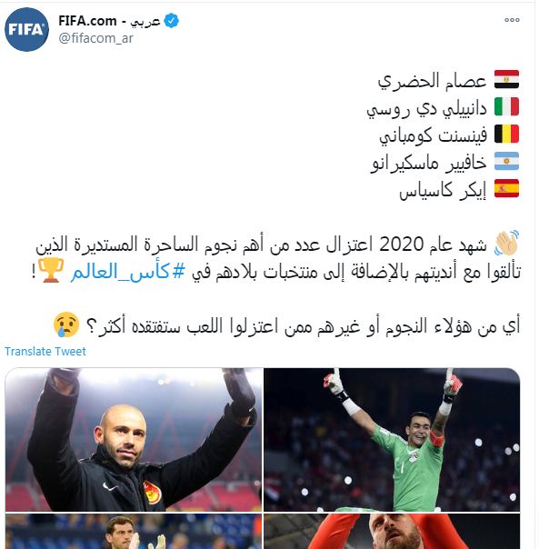 وضمت قائمة فيفا أهم نجوم الساحرة المستديرة الذين اعتزلوا في 2020، عصام الحضري (مصر)، دانييلي دي روسي (ايطاليا)، فينسنت كومباني (بلجيكا)، خافيير ماسكيرانو (الارجنتين)، إيكر كاسياس (اسبانيا).