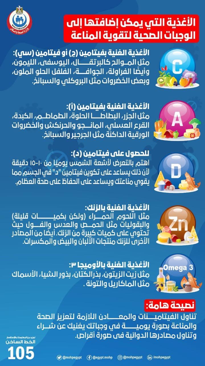 وأضافت الوزارة أنه يمكن الحصول علي الزنك من اللحوم والبقوليات والحمص، وتابعت: يجب الاهتمام بالطهي الجيد واتباع الطرق السليمة . وتواصل وزارة الصحة والسكان رفع استعداداتها بجميع محافظات الجمهورية، ومتابعة الموقف أولاً بأول بشأن فيروس "كورونا المستجد"، واتخاذ كافة الإجراءات الوقائية اللازمة ضد أي فيروسات أو أمراض معدية، كما قامت الوزارة بتخصيص عدد من وسائل التواصل لتلقي استفسارات المواطنين بشأن فيروس كورونا المستجد والأمراض المعدية، منها الخط الساخن "105"، و"15335" ورقم الواتساب "01553105105"، بالإضافة إلى تطبيق "صحة مصر" المتاح على الهواتف.