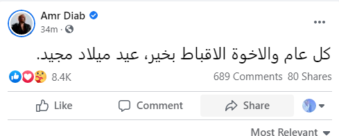 حرص الهضبة عمرو دياب على تهنئة متابعيه وكافة الأقباط بمناسبة عيد الميلاد، وذلك من خلال حسابه الرسمي على موقع فيس بوك، وكتب : " كل عام والأخوة الأقباط بخير، عيد ميلاد مجيد".