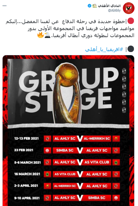 علق النادى الأهلى عبر حسابه على تويتر، على قرعة دور المجموعات لبطولة دورى أبطال إفريقيا، مشيرا إلى أنها خطوة جديدة فى رحلة الدفاع عن اللقب المفضل، حيث كان بطلا للبطولة الأخيرة بعد غياب 7 سنوات، على حساب غريمه التقليدي نادى الزمالك.