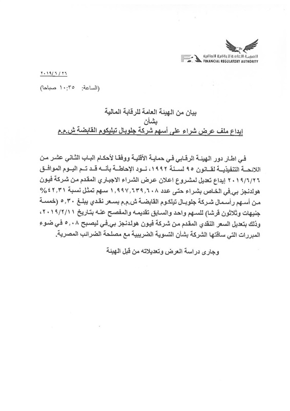 قالت الهيئة العامة للرقابة المالية، إنه تم اليوم إيداع تعديل لمشروع إعلان عرض الشراء الإجباري المقدم من شركة "فيون هولدنجز بى في" الخاص بشراء حتى 1،997،639،608 أسهم، تمثل نسبة 42،31% من أسهم رأسمال شركة جلوبال تليكوم القابضة بسعر نقدي يبلغ 5،30 (خمسة جنيهات وثلاثين قرشًا) للسهم الواحد والسابق تقديمه والمفصح عنه بتاريخ 11/02/2019، بتعديل السعر النقدي المقدم من شركة "فيون هولدنجز بى.في" ليصبح 5،08 في ضوء المبررات التي ساقتها الشركة بشأن التسوية الضريبية مع مصلحة الضرائب المصرية، وجار دراسة العرض وتعديلاته من قبل الهيئة.