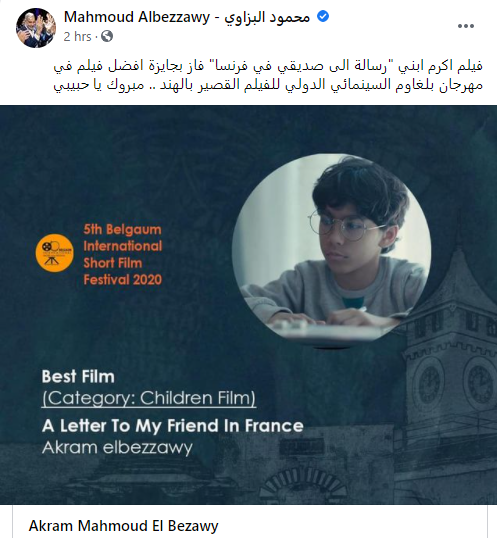 أعلن الفنان محمود البزاوي، فوز فيلم ابنه أكرم البزاوي "رسالة إلى صديقي في فرنسا"، بأفضل فيلم في مهرجان بلجاوم، حيث كتب على حسابه فيس بوك منشورًا قال فيه: "فيلم أكرم ابني "رسالة الى صديقي في فرنسا" فاز بجائزة افضل فيلم في مهرجان بلغاوم السينمائي الدولي للفيلم القصير بالهند .. مبروك يا حبيبي".