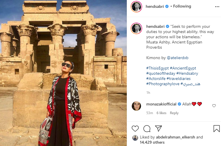 ظهرت النجمة التونسية هند صبرى، فى إطلالة مميزة من أمام أحد المعابد المصرية القديمة، واختارت التعليق على الصورة بمثل شعبى من الأمثال المصرية القديمة قائلة "اسع لأداء واجباتك بأعلى قدراتك، وبهذه الطريقة ستكون أفعالك بلا لوم".