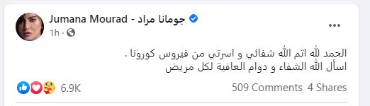 أعلنت النجمة السورية جومانا مراد، شفاءها هي وأسرتها من فيروس كورونا، وكتبت جومانا عبر حسابها على فيس بوك، قائلة:"الحمد لله أتم الله شفائي وأسرتي من فيروس كورونا أسأل الله الشفاء ودوام العافية لكل مريض".