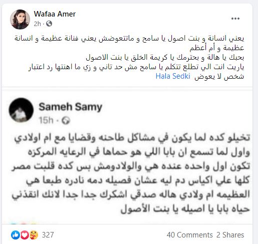 وكتبت وفاء، عبر حسابها على فيس بوك، قائلة:" يعني إنسانة و بنت أصول يا سامح و ماتتعوضش يعني فنانة عظيمة وإنسانة عظيمة وأم أعظم بحبك يا هالة وبحترمك يا كريمة الخلق يا بنت الاصول ياريت انت اللي تطلع تتكلم يا سامح مش حد تاني و زي ما أهنتها رد اعتبار شخص لا يعوض".