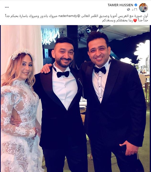 وهنأ تامر حسين، نادر حمدي على عقد قرآنه قائلاً: "أول صورة مع العريس أخويا وصديق العُمر الغالي نادر حمدي، مبروك يا ندور ومبروك ياسارة بحبكم جدًا جدًا جدًا.. ربنا يحفظكم ويسعدكم".