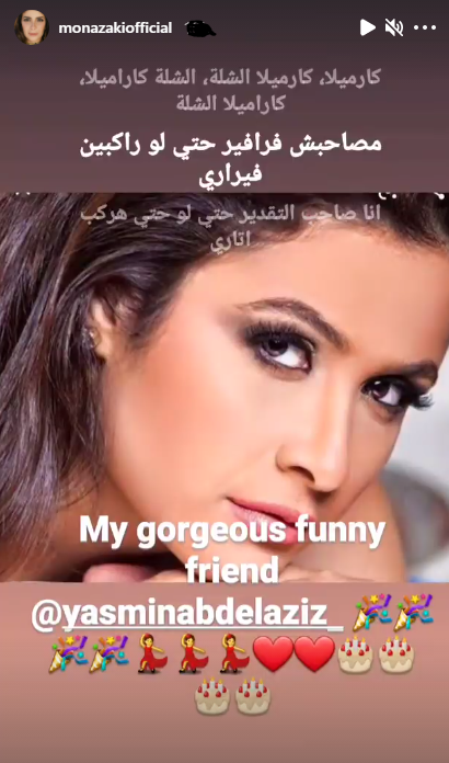 وواصلت مني زكي احتفالها بعيد ميلاد ياسمين عبد العزيز، ونشرت مجموعة صور لها على أنغام أغنية المهرجانات "أخواتي"، مصحوبة بتعليق :"صديقتي الرائعة المضحكة".
