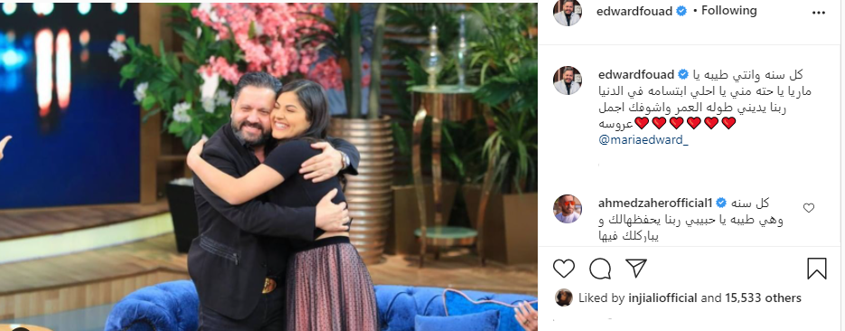 حرص النجم إدوارد على الاحتفال بعيد ميلاد ابنته "ماريا" ونشر صورة تجمعهما عبر حسابه بموقع "انستجرام"، مصحوبة بتعليق :"كل سنه وانتي طيبة يا ماريا يا حتة مني يا احلي ابتسامه في الدنيا ربنا يديني طوله العمر واشوفك اجمل عروسة"، ولاقت الصورة الكثير من الإعجاب من متابعيه، ومنهم النجم أحمد زاهر الذي علق قائلا :"كل سنة وهي طيبة و ربنا يخليكوا لبعض".