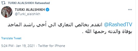 حرص المستشار تركى آل الشيخ، رئيس هيثة الترفيه بالمملكة العربية السعودية، على تقديم واجب العزاء فى الفنان السعودى راشد الماجد، لوفاة والدته، التي غادرت عالمنا صباح اليوم، حيث كتب فى تغريدة عبر حسابه الشخصى بموقع تويتر "أتقدم بخالص التعازي إلى أخي راشد الماجد فى وفاة والدته رحمها الله".