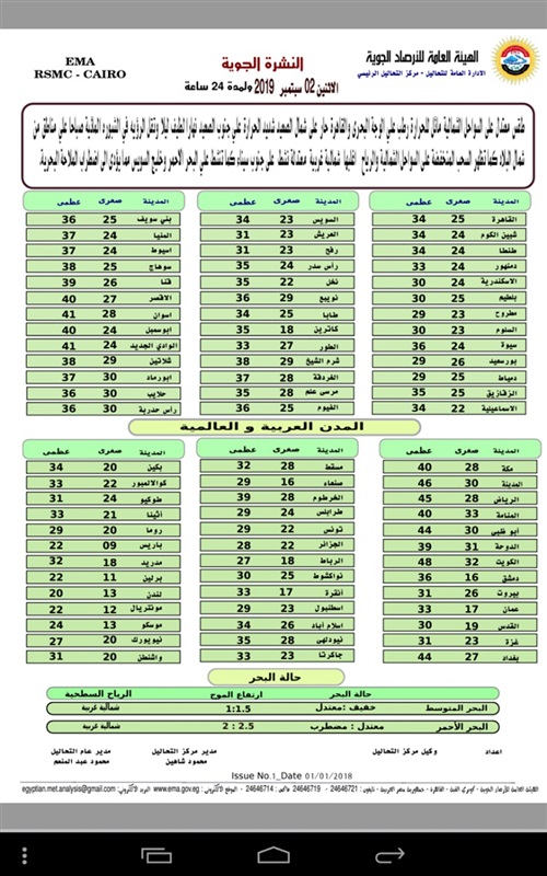 وفيما يلى بيان بدرجات الحرارة اليوم..