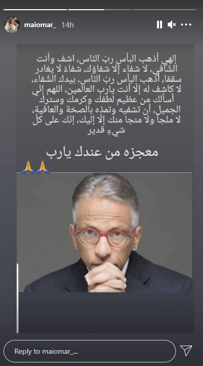 حرصت النجمة مى عمر، الدعاء لخبير التجميل ومصفف الشعر محمد الصغير، بعد مروره بأزمة صحية، حيث نشرت مى صورة لمحمد الصغير، عبر خاصية ستورى على حسابها على إنستجرام، وكتبت قائلة:" اللهم أذهب البأس رب الناس، أشف وأنت الشافى، لا شفاء إلا شفاؤك، شفاء لا يغادر سقما، أذهب البأس رب الناس، بيدك الشفاء، لا كاشف له إلا أنت يارب العالمين، اللهم إنى أسألك من عظيم لطفك وكرمك وسترك الجميل، أن تشفيه وتمده بالصحة والعافية، لا ملجأ ولا منجا منك إلا إليك إنك على كل شيء قدير معجزة من عندك يارب".