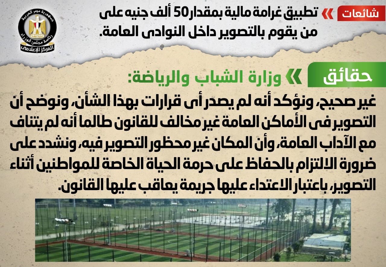 كشف المركز الإعلامى لمجلس الوزراء إنه فى ضوء ما تردد من أنباء بشأن تطبيق غرامة مالية بمقدار 50 ألف جنيه على من يقوم بالتصوير داخل النوادي العامة، تواصل المركز مع وزارة الشباب والرياضة، والتي نفت تلك الأنباء، مُؤكدةً أنه لا صحة لتطبيق غرامة مالية بمقدار 50 ألف جنيه على من يقوم بالتصوير داخل النوادي العامة.