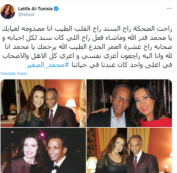 حرصت الفنانة لطيفة التونسية، على نعى مصفف الشعر الشهير محمد الصغير، فى تدوينه عبر حسابها الشخصى على موقع "تويتر"، حيث نشرت مجموعة من الصور لهما معا، وعلقت عليها: "راحت الضحكة.. راح السند.. راح القلب الطيب.. أنا مصدومة لغيابك يا محمد قدر الله وماشاء فعل.. راح اللي كان سند لكل أحبابه و صحابه.. راح عشرة العمر الجدع الطيب الله يرحمك يا محمد.. إنا لله وإنا اليه راجعون.. أعزي نفسي وأعزي كل الأهل والأصحاب في أغلى واحد كان عندنا في حياتنا #محمد_الصغير".
