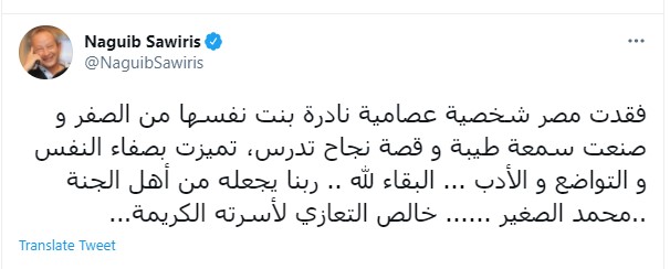 نعى رجل الأعمال نجيب ساويرس، خبير التجميل محمد الصغير، والد الإعلامية مها الصغير، الذى رحل عن عالمنا، اليوم الجمعة، إثر تدهور حالته بعد الإصابة بفيروس كورونا، وكتب ساويرس في تدوينه عبر "تويتر"، "فقدت مصر شخصية عصامية نادرة بنت نفسها من الصفر، وصنعت سمعة طيبة وقصة نجاح تدرس، تميزت بصفاء النفس والتواضع والأدب.. البقاء لله.. ربنا يجعله من أهل الجنة.. محمد الصغير.. خالص التعازي لأسرته الكريمة".