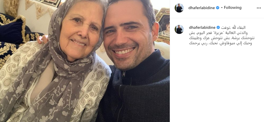 ونشر العابدين، عبر حسابه على إنستجرام، صورة مع والدته الراحلة، وكتب فى تعليقه عليها: "البقاء لله.. توفيت والدتى الغالية "عزيزة" فجر اليوم، بش نتوحشك برشة، بش نتوحش عزك وطيبتك وحبك إلى ميوفاوش نحبك.. ربى يرحمك".