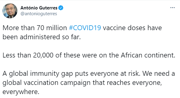حذر أنطونيو جوتيريس، الأمين العام لمنظمة الأمم المتحدة، من الفجوة في توزيع لقاحات كورونا على مستوى دول العالم، موضحا أن الفجوة التي تحدث في المناعة العالمية نتيجة عدم التوزيع العادل للقاحات على الدول ستعرض الجميع للخطر، وغرد أنطونيو جوتيريس، الأمين العام لمنظمة الأمم المتحدة، على حسابه الرسمي بموقع "تويتر"، قائلا: "تم إعطاء أكثر من 70 مليون جرعة لقاح كورونا حتى الآن، وأقل من 20000 من هؤلاء كانوا في القارة الأفريقية"، مضيفًا أن "فجوة المناعة العالمية تعرض الجميع للخطر.. ونحن بحاجة إلى حملة تطعيم عالمية تصل إلى الجميع في كل مكان".