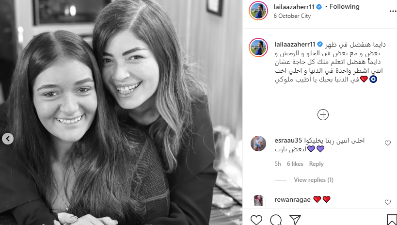 عبرت الفنانة الشابة ليلي زاهر عن حبها الكبير لشقيقتها ملك زاهر، ونشرت مجموعة صور تجمعهما عبر حسابها بموقع "انستجرام"، ظهرا خلالها بإطلالة بالأبيض والأسود، مصحوبة بتعليق :"دايما هنفضل في ظهر بعض و مع بعض في الحلو و الوحش ودايماً هفضل اتعلم منك كل حاجة عشان انتي اشطر واحدة في الدنيا وأحلي أخت في الدنيا بحبك يا أطيب ملوكي".