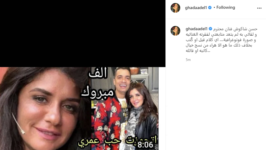 ونشرت غادة، عبر حسابها على إنستجرام، الصورة المتداولة حول زواجهما، قائلة: "حسن شاكوش فنان محترم ولقائى به لم يتعد متابعتى لفقرته الغنائية وصورة فوتوغرافية، أى كلام قيل أو كُتب بخلاف ذلك ما هو إلا هراء من نسج خيال كاتبه أو قائلة".