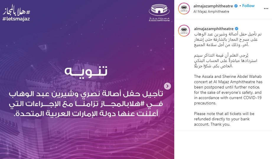 وكتب حساب المسرح الرسمى عبر إنستجرام: "تم تأجيل حفل أصالة وشيرين عبد الوهاب على مسرح المجاز بالشارقة حتى إشعار آخر، وذلك من أجل سلامة الجميع، يُرجى العلم أن قيمة التذاكر سيتم استردادها مباشرةً على الحساب البنكى الخاص بكم.. شكرًا جزيلًا".