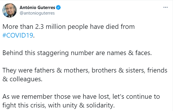 وغرد أنطونيو جوتيريس، الأمين العام لمنظمة الأمم المتحدة، على حسابه الرسمى بموقع "تويتر"، قائلا: "توفى أكثر من 2.3 مليون شخص بسبب فيروس كورونا، وراء هذا الرقم المذهل توجد أسماء ووجوه. كانوا آباء وأمهات وإخوة وأخوات وأصدقاء وزملاء. بينما نتذكر أولئك الذين فقدناهم، فلنواصل محاربة هذه الأزمة بالوحدة والتضامن".