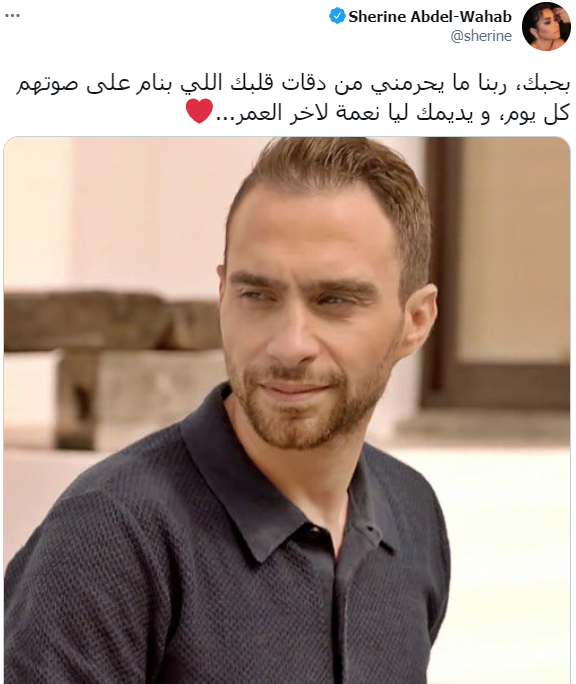 تغزلت النجمة شيرين عبد الوهاب، فى زوجها المطرب حسام حبيب، بالتزامن مع احتفالات الفلانتين التى يحتفل بها العالم يوم 14 فبراير من كل عام، معبرة عن حبها الشديد له، داعية الله ألا يحرمها منه وأن يديمه نعمة لها حتى نهاية العمر، ونشرت شيرين، صورة لزوجها حسام حبيب، عبر حسابها على تويتر، صحبتها بتعليق: "بحبك.. ربنا ما يحرمنى من دقات قلبك اللى بنام على صوتهم كل يوم، ويديمك ليا نعمة لآخر العمر".
