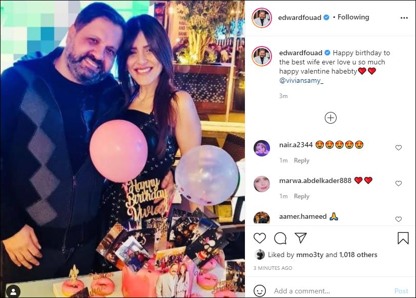 برسالة رومانسية، احتفل الفنان إدوارد، بعيد ميلاد زوجته فيفيان سامى، الموافق اليوم 13 فبراير، عبر حسابه بموقع "إنستجرام"، والذى حقق نجاحا كبيرا من خلال شخصية مجدى هلال الذى يجسدها فى مسلسل لؤلؤ المعروض حاليا على قناة ON.