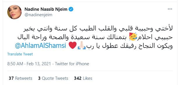 هنأت النجمة نادين نسيب نجيم، النجمة أحلام بمناسبة عيد ميلادها التي تحتفل به اليوم، حيث أنها من مواليد 13 فبراير عام 1968، وغردت نادين نجيم، عبر حسابها على تويتر، قائلة:" لأختي وحبيبة قلبي والقلب الطيب كل سنة وانتي بخير حبيبتى بتمنا لك سنة سعيدة والصحة وراحة البال ويكون النجاح رفيقك عالطول يارب".